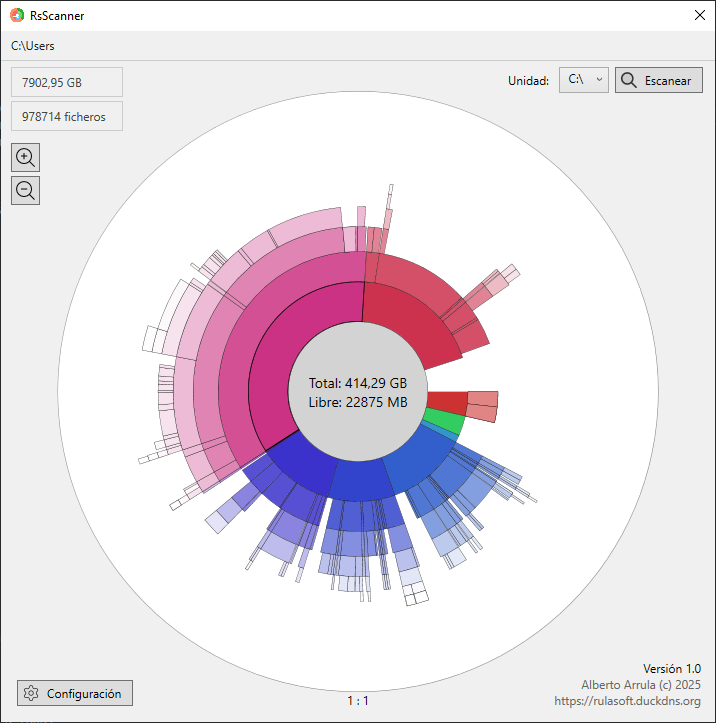 Es entonces cuando a base de mucho buscar encontré una pequeña aplicación que era justo lo que buscaba. Se trata de Scanner de Steffen Gerlach. Una aplicación que parece simple, pero que creo que esconde una complejidad interna muy grande para ser capaz de pintar un gráfico de tipo Sunburst.